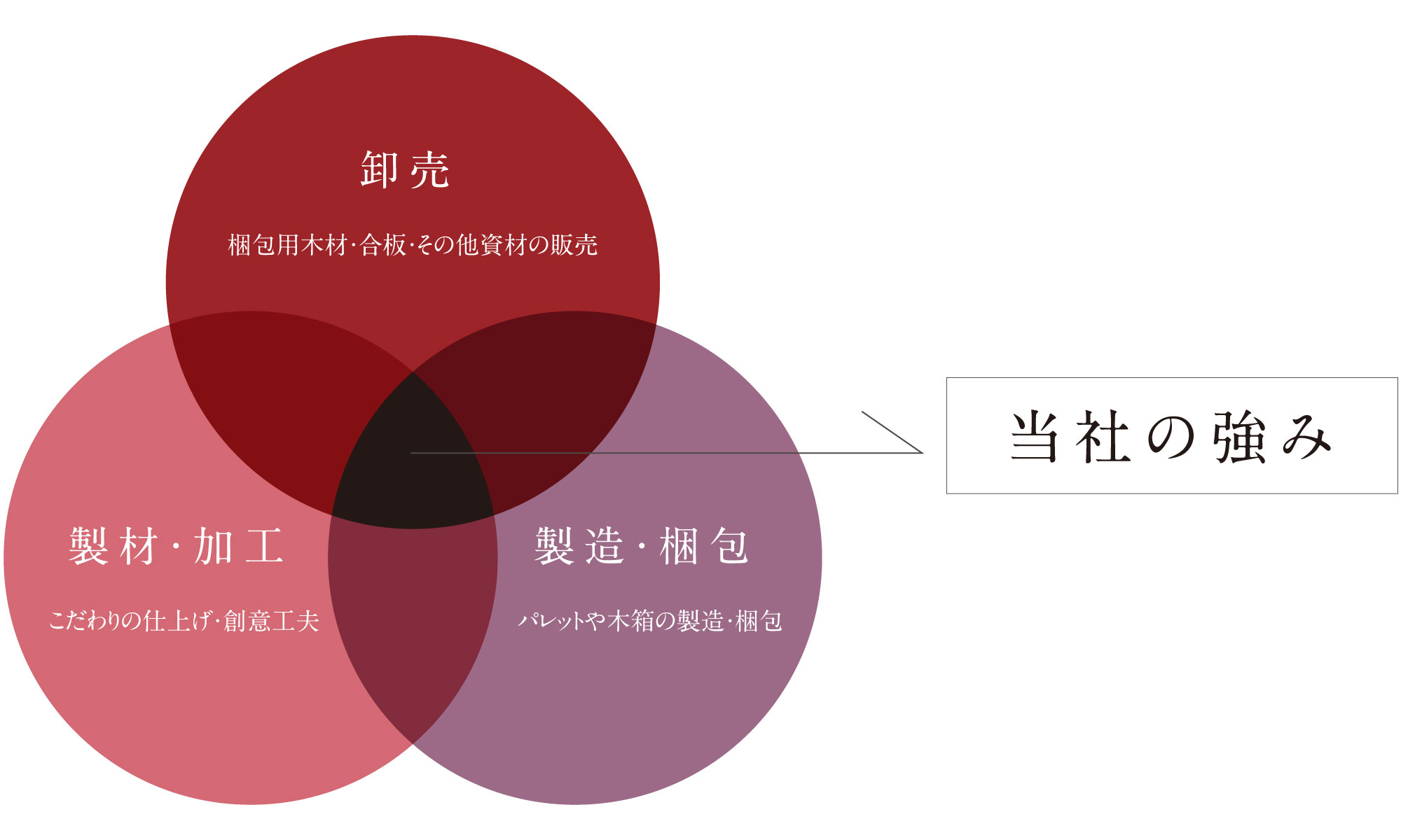 創業より材木問屋を本業とし、梱包用木材を主に取り扱っております。国内外の製材メーカーや商社より仕入れた確かな品質の資材を取りそろえ、必要な時にいち早く、お待たせしない安定供給を強みにしています。